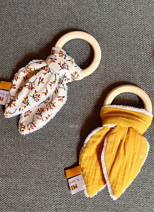 Handgefertigte Stoffgreiflinge mit Ring aus Buchenholz. Die Stofföhrchen sind doppelseitig: einerseits aus Baumwolle oder Baumwollmusselib,...