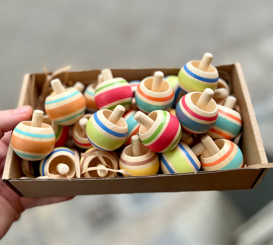 Echtholzkreisel bunt bedruckt. Maßen: Durchmesser: 8 cm, Höhe: 3,5 cm Geeignet für Kinder ab 3...