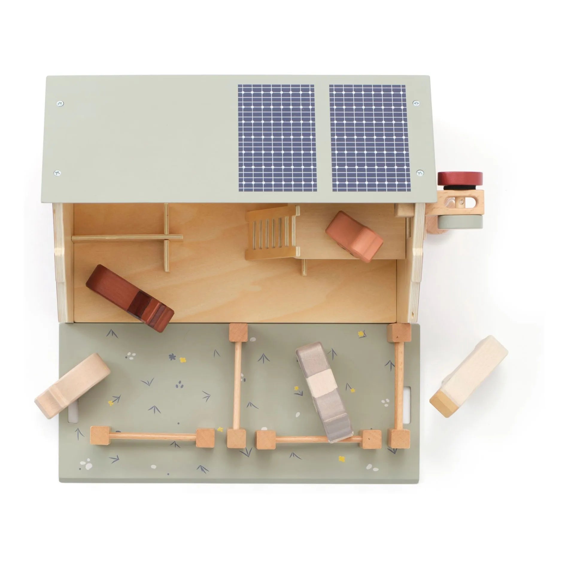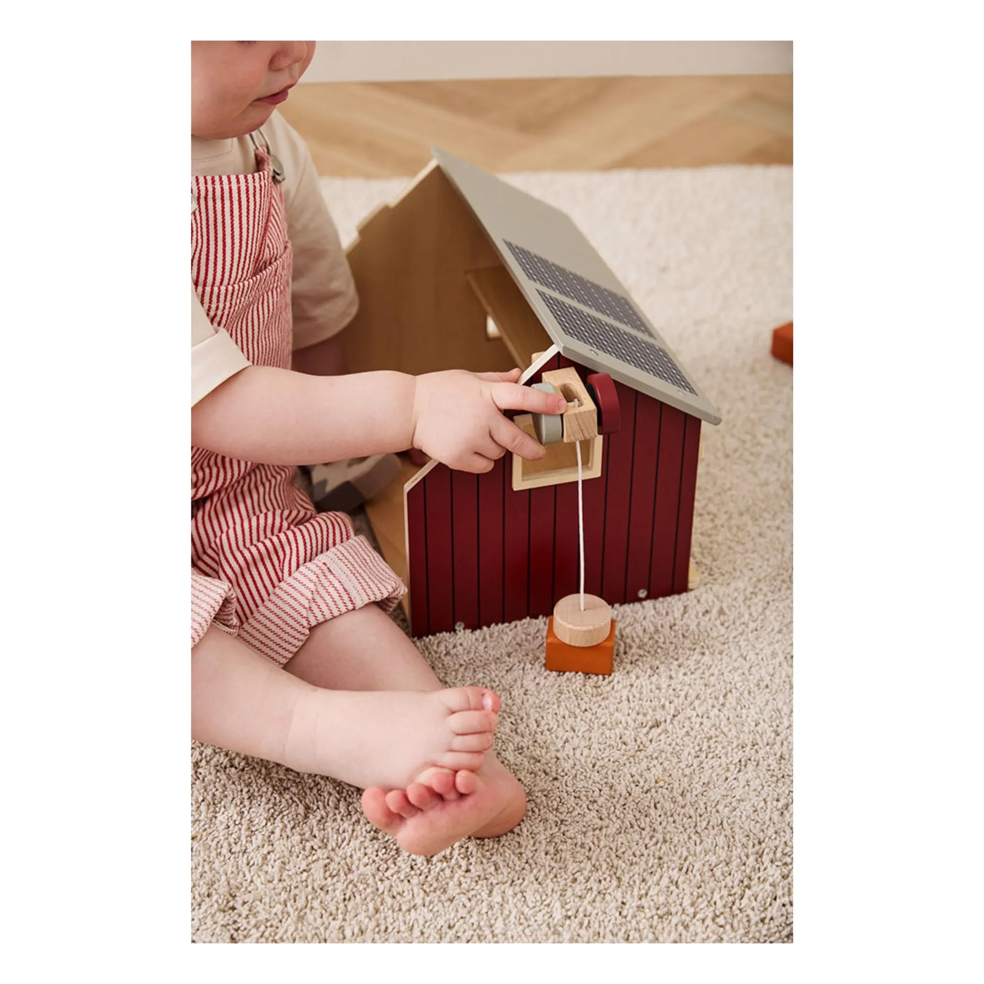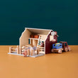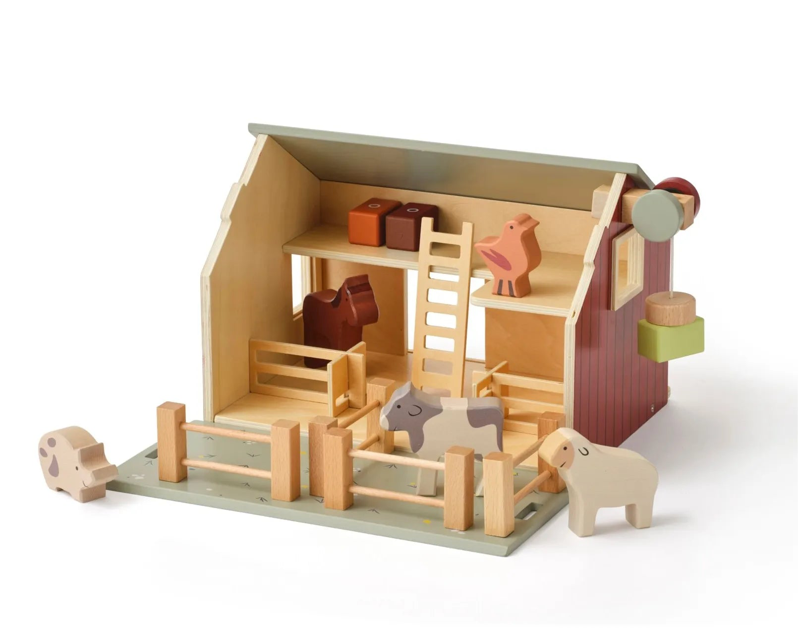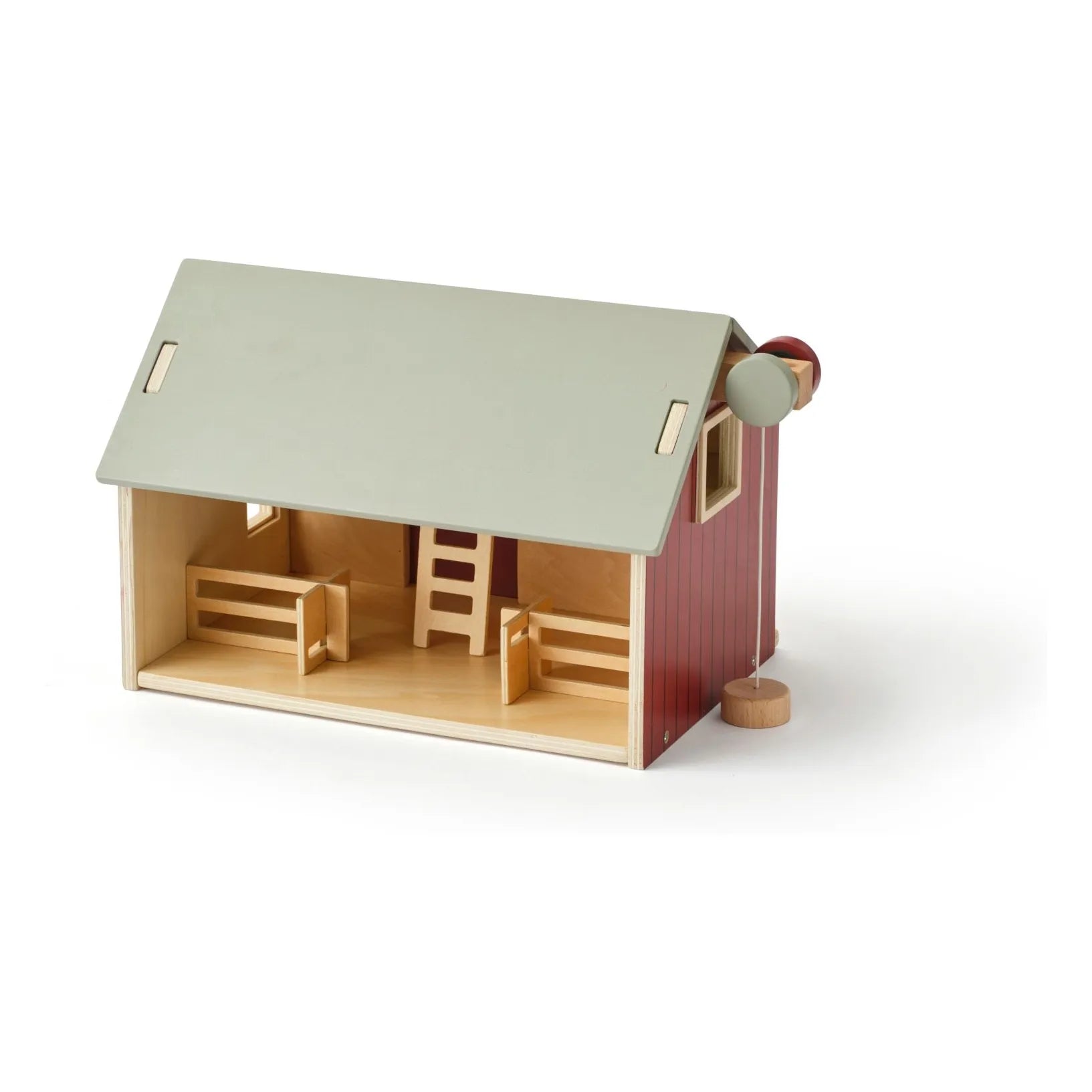 Los geht’s auf den Bauernhof und auf Entdeckungstour in diese Scheune mit zwei Ebenen. Das Holzhaus ist mit einer Schiebetür, ausgesägten Fenstern und energieeffizienten Sonnenkollektoren auf dem Dach versehen. Wenn man das Vorderdach abnimmt und umdreht, wird daraus eine Blumenwiese, auf der sich die Tiere austoben können. Mithilfe der funktionellen Winde mit magnetischem „Haken“ können Heuballen nach oben befördert werden. Komplettiert wird das Set mit einer Leiter und zwei Zaunelementen, mit denen sich die verschiedensten ländlichen Szenarien gestalten lassen. Nach dem Spielen werden die Heuballen ordentlich auf der oberen Ebene verstaut. Die Scheune ist eine hübsche Ergänzung für jedes Spielzimmer und lädt zum fantasievollen Nachahmen des Landlebens ein.