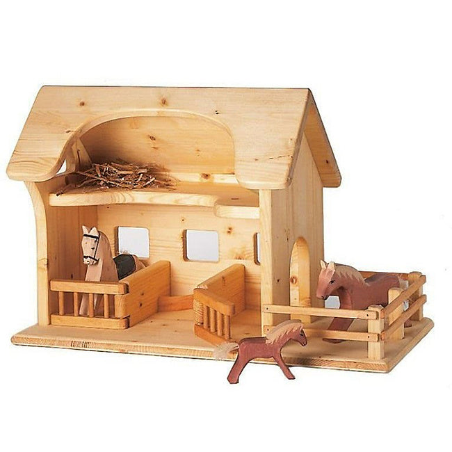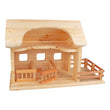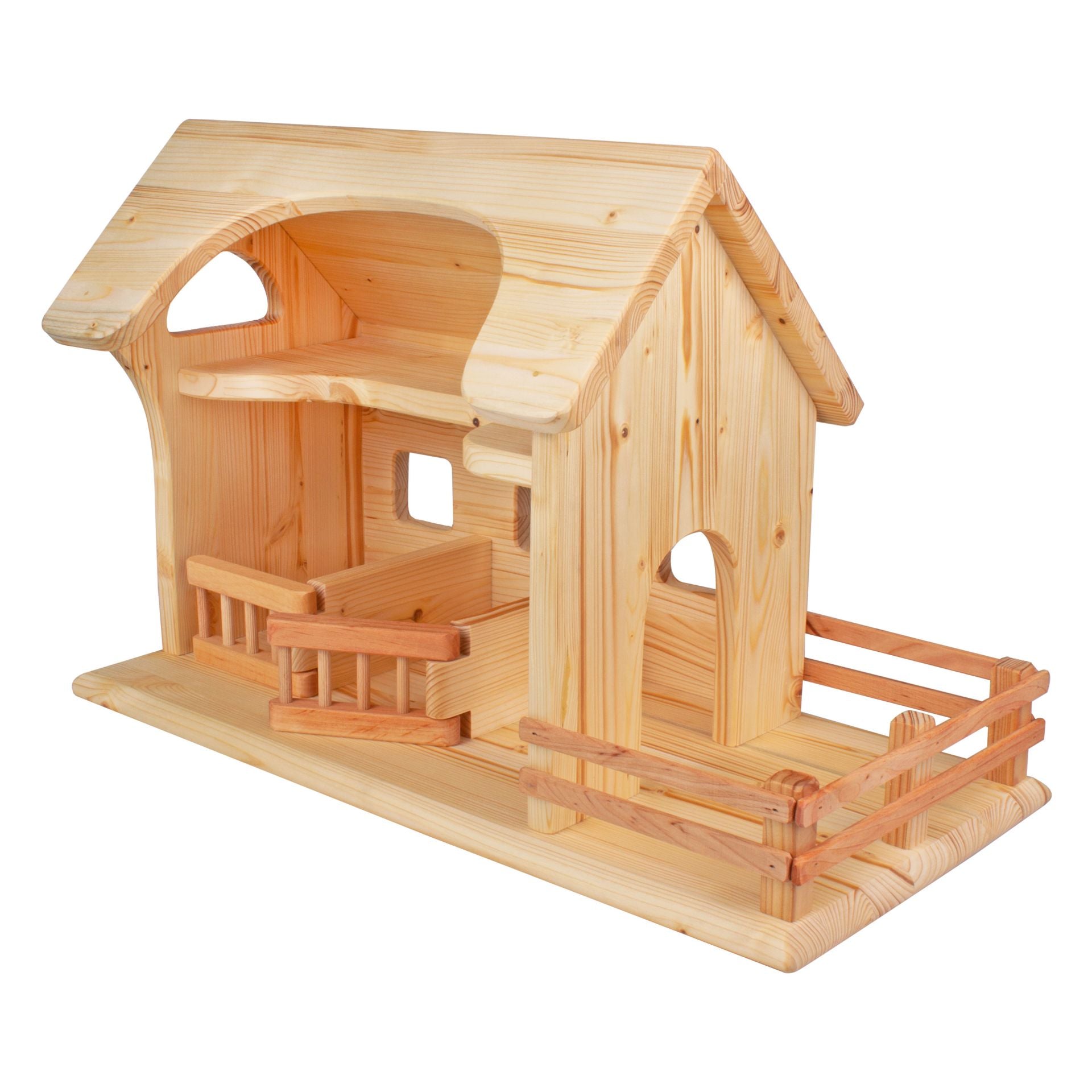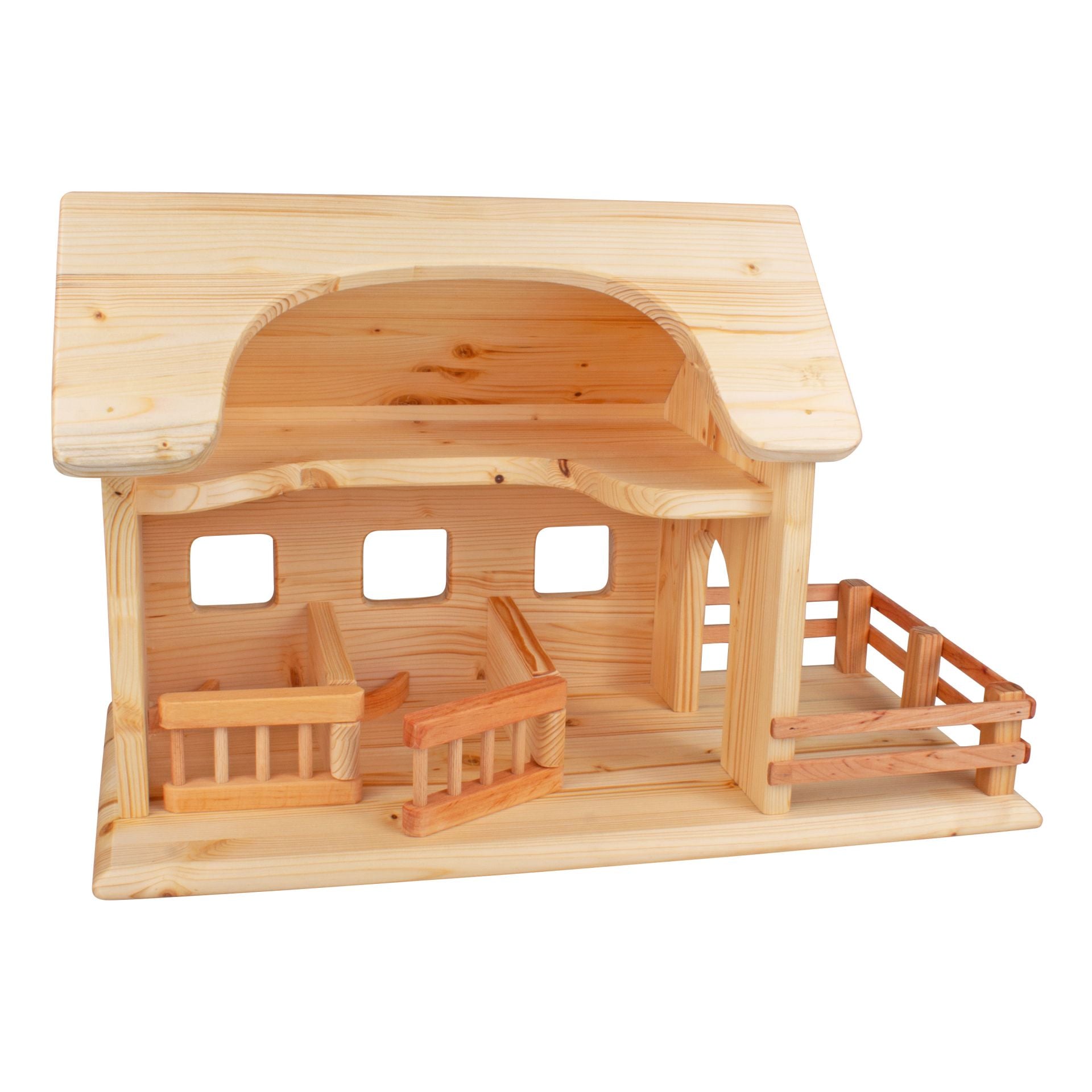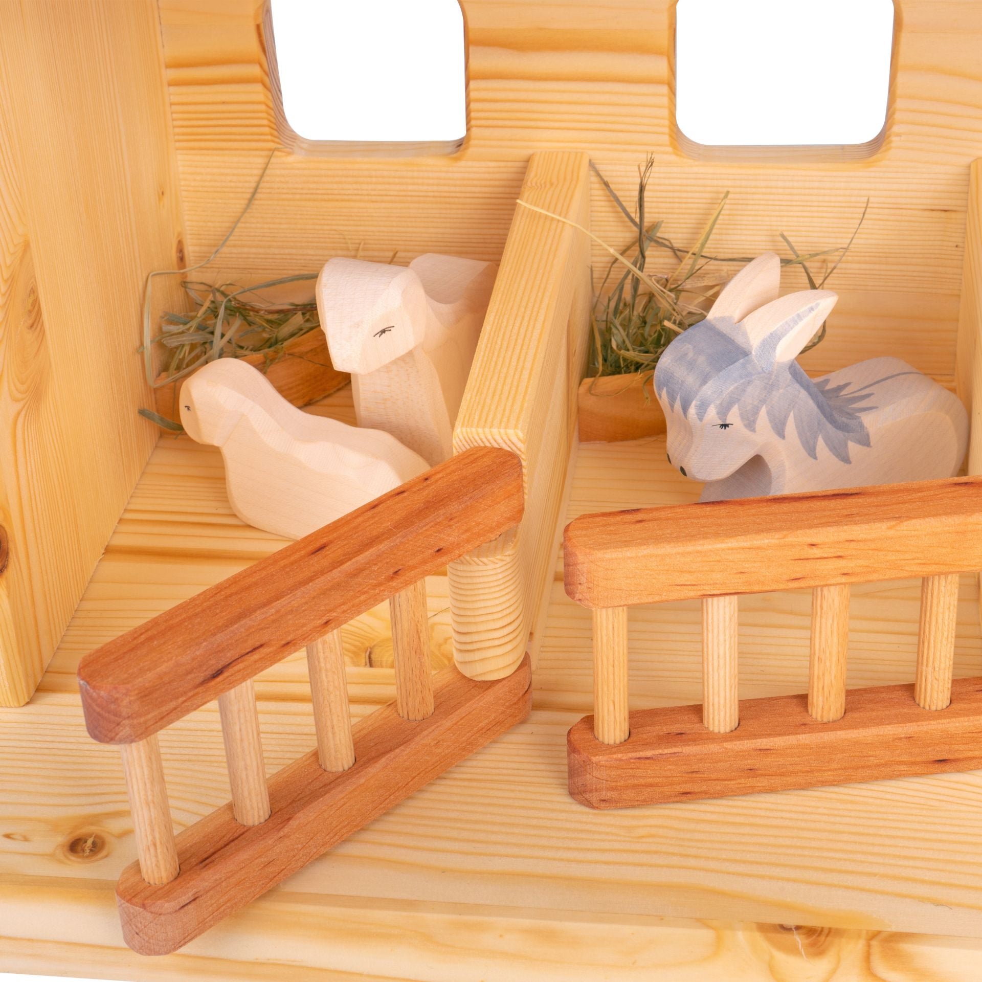 Drei Blätter Naturspielwaren Pferdestall aus wunderschönem hellen, geölten Fichtenholz. Durch die glatt geschliffenen Oberflächen fühlt sich das Holz sehr angenehm weich an.