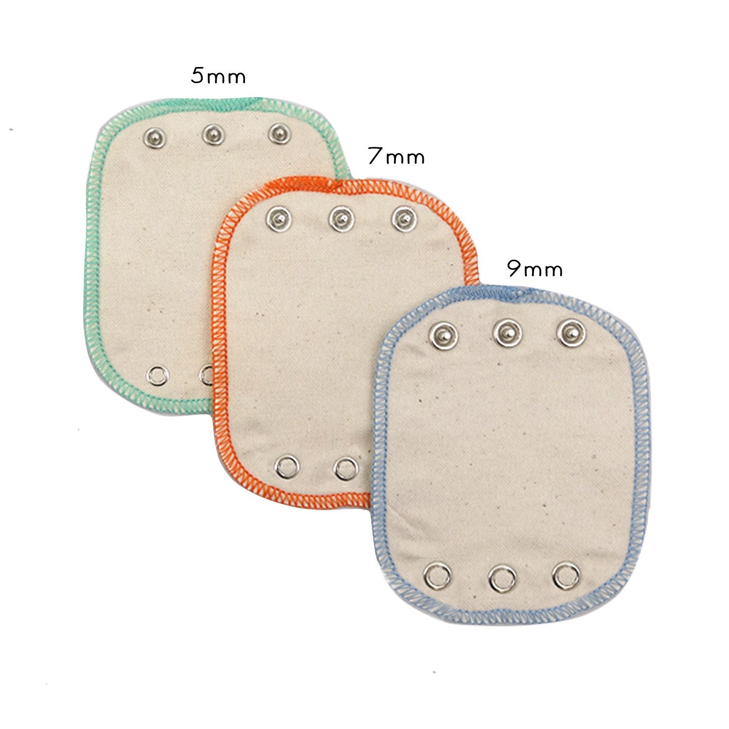 Die Verlängerungen können ganz leicht an einen Body geknöpft werden und erweitern ihn so um ungefähr 7cm - also in etwa eine Kleidergröße.Die meisten gängigen Bodys, die es in Deutschland gibt, können mit den Verlängerungen von Avo&Cado genutzt werden. Die Verlängerungen kommen in einem 3er Pack und enthalten drei verschiedene Druckknopfgrößen (9mm, 7mm und 5mm), damit sind die meisten Bodys mit Druckknöpfen aus Metall abgedeckt. Die Knöpfe stehen ungefähr 2cm auseinander.