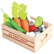 Wunderschöne Auswahl von Gartengemüse aus Holz und Stoff in einer Holzkkiste.