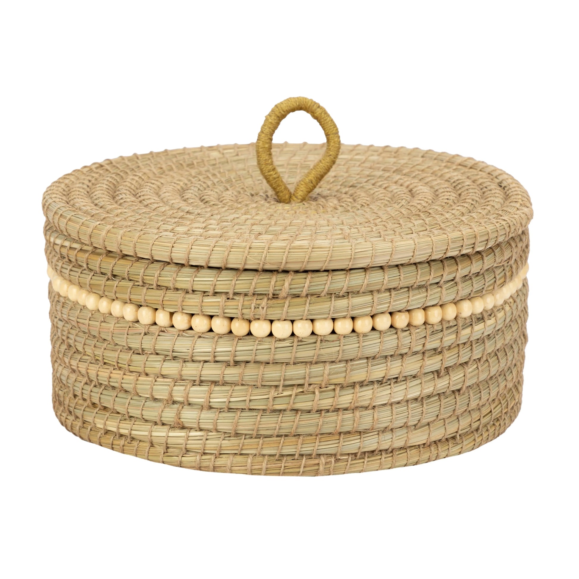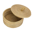 Dieser vielseitige Aufbewahrungskorb besticht mit Funktionalität und farbigen Details: Kaisa-Gras und Palmblatt sind mit kunterbunten Jutefäden umwickelt, wodurch ein wunderschönes Design entsteht.
