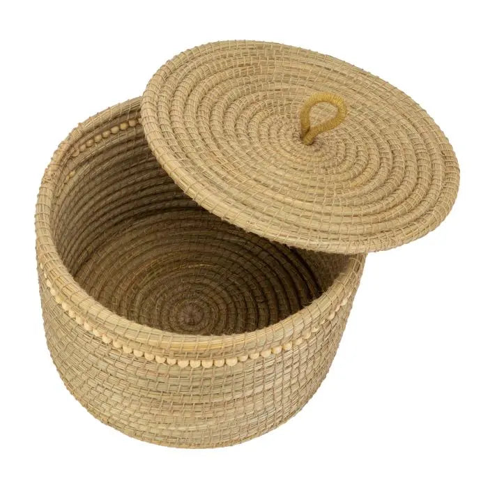 Dieser vielseitige Aufbewahrungskorb besticht mit Funktionalität und farbigen Details: Kaisa-Gras und Palmblatt sind mit kunterbunten Jutefäden umwickelt, wodurch ein wunderschönes Design entsteht.