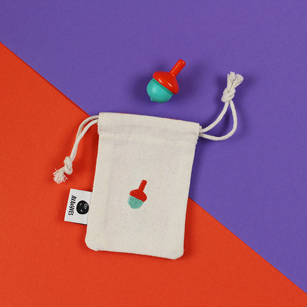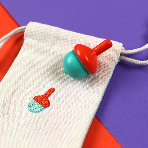 Wir liefern unsere bunten Holzkreisel in einem hochwertigen Säckchen aus reiner Baumwolle mit Stickerei. Das perfekte kleine Mitbringsel.
