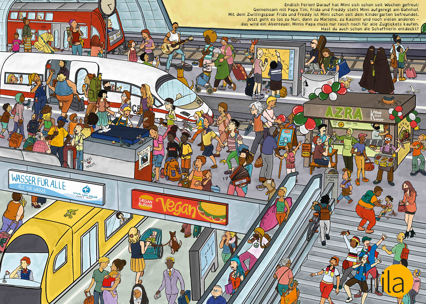 Das Wimmelbuch Mimis kunterbunte Ferien bricht alte und stereotypische Darstellungen des menschlichen Miteinanders auf – und das bereits im Kinderzimmer. Mimi geht auf Reisen und entdeckt dabei die kunterbunte Vielfalt unseres Zusammenlebens. Denn die häufig dargestellte Familien bestehend aus Mama, Papa, Kind und Hund, die gemeinsam in einem freistehenden Einfamilienhaus leben, ist längst nicht alles, was in unserer Gesellschaft zu finden ist. Und so besucht Mimi Freundinnen und Freunde, die mit ihren Eltern zum Beispiel im Plattenbau, mit der Großfamilie auf dem Bauernhof oder mit Papa auf dem Hausboot leben.