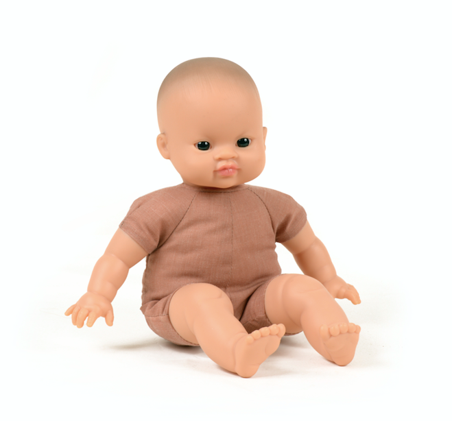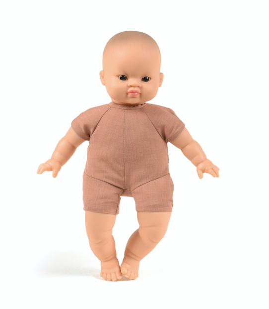 Süße Puppe mit Weichkörper aus Baumwolle und Glieder aus Vinyl.