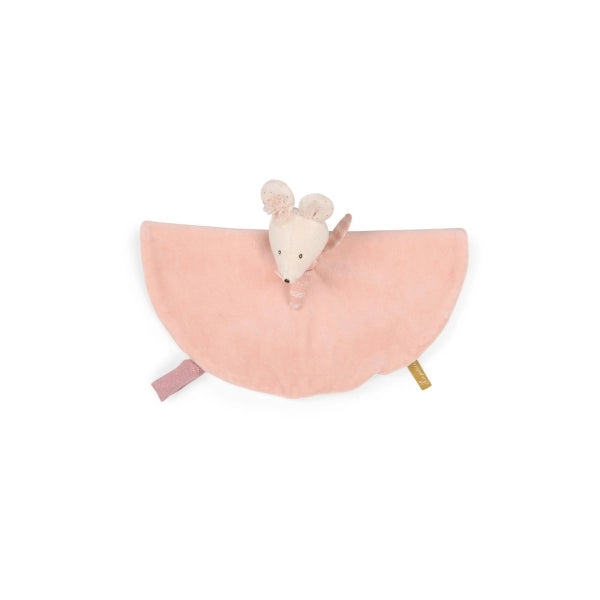 Weiches Maus-Schmusetuch mit süßem aufgesticktem Gesicht. Hergestellt aus puderrosa und cremefarbenem Frottee-Velours. Flach und rund, ist es für kleine Hände leicht zu greifen. An der Schlaufe mit Klettverschluss kann der Schnuller befestigt werden.