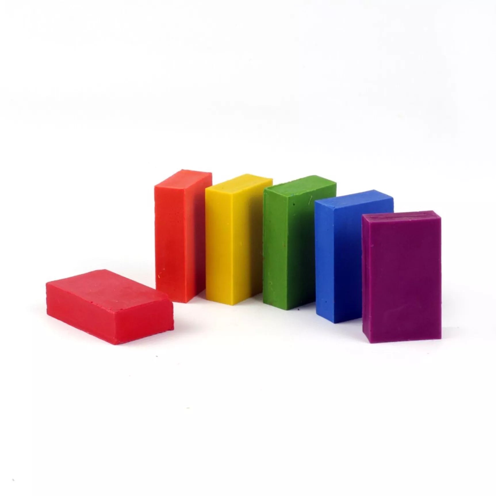 Inhaltsstoffe: Pflanzliche Stearine, über 25 % reines Bienenwachs, pflanzliche Wachse, gereinigte Champagnerkreide, Lanolin, Kieselsäure, hoher Anteil von Lebensmittelfarben, Erd- und Mineralpigmenten, stabilisiert mit ausgesuchten organischen Pigmenten. Die Wachsblöckchen sind glutenfrei.
